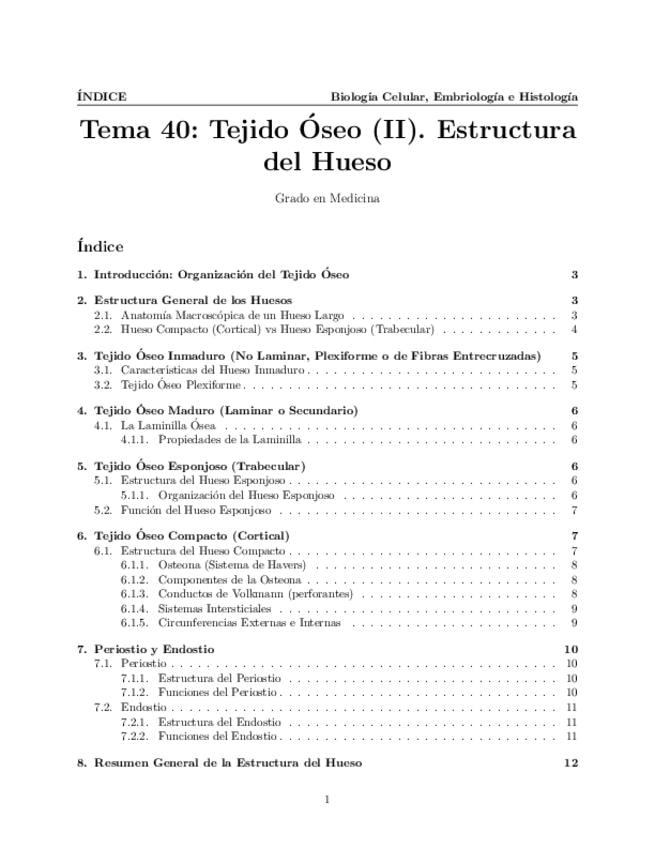 Tema 40. El Tejido Óseo (II). Estructura general de los huesos. Tejido óseo: plexiforme/inmaduro y laminar/maduro. Estructura microscópica general del hueso secundario o maduro: laminilla ósea. Tejido óseo esponjoso/trabecular y compacto/cortical: sistema