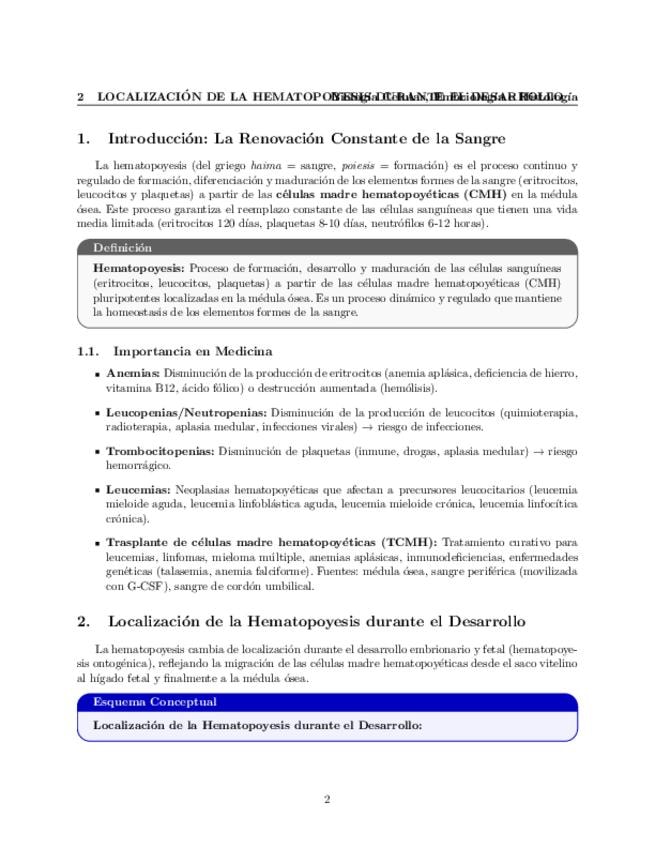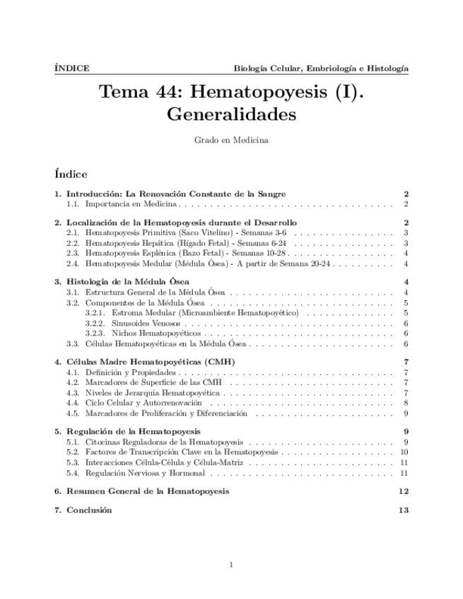 Tema 44. Hematopoyesis (I). Generalidades. Localización de la hematopoyesis durante el desarrollo. Histología de la médula ósea. Células madre hematopoyéticas. Regulación de la hematopoyesis