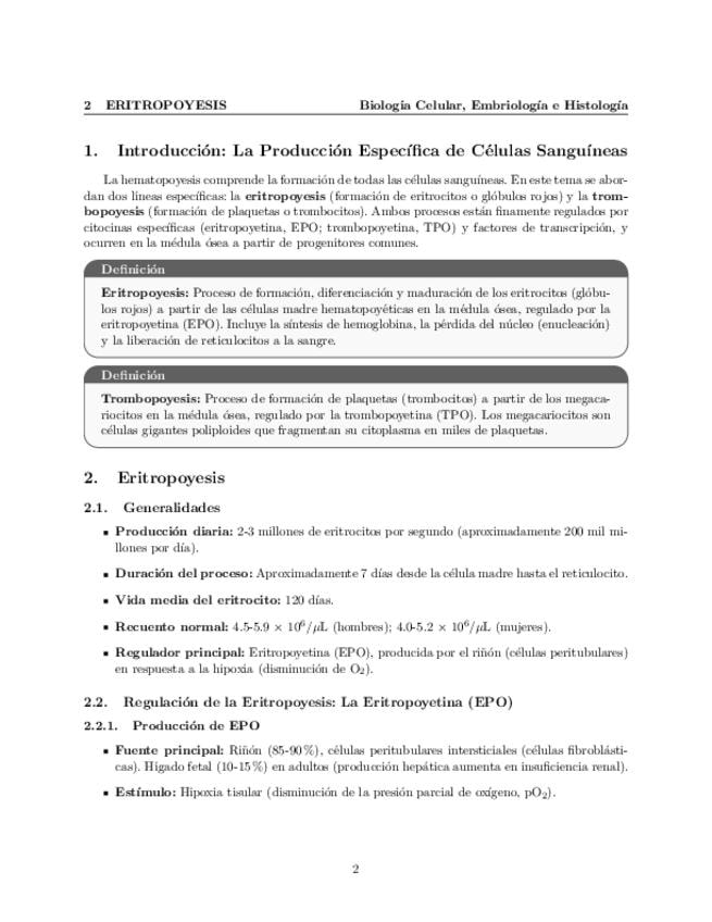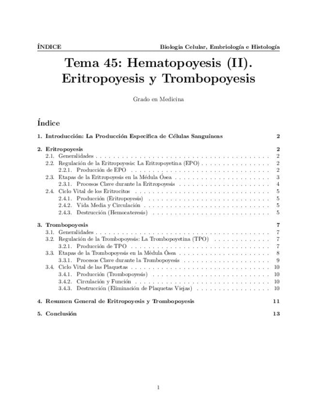 Tema 45. Hematopoyesis (II). Eritropoyesis. Ciclo vital de los eritrocitos. Trombopoyesis