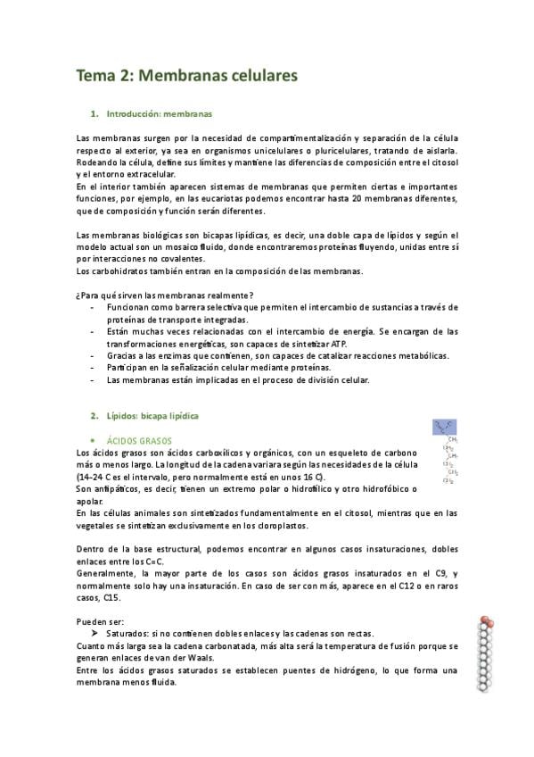 Apuntes del tema 2, membranas celulares, de Biología Celular del primer curso de Biotecnología de la UPV.