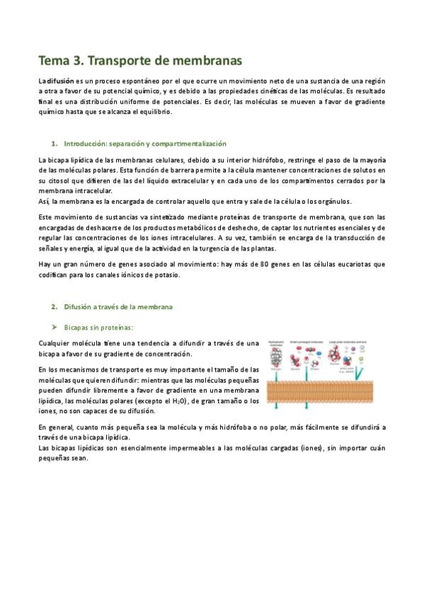 Apuntes del tema 3, transporte a través de la membrana, de Biología Celular del primer curso de Biotecnología de la UPV.
