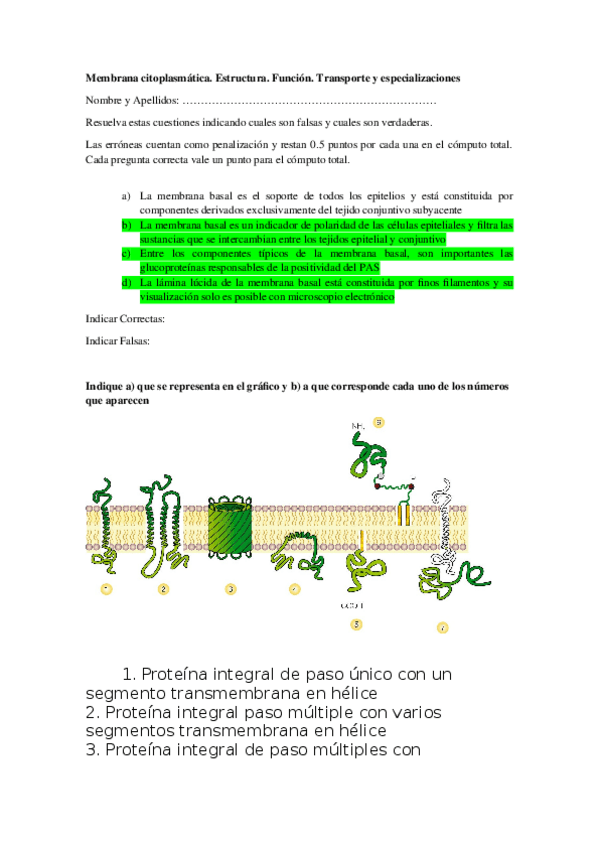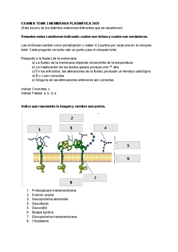 Examen parcial del tema 3 sobre la membrana plasmática del curso 2025/2026 de biología celular