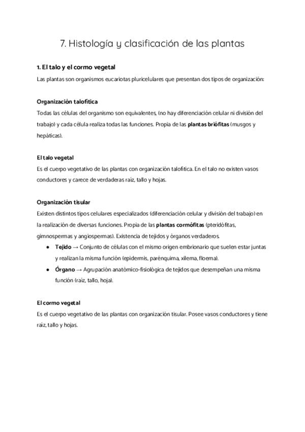 1. El talo y el cormo vegetal 2. Tejidos vegetales 3. Clasificación de las plantas 4. Aparato vegetativo de las cormófitas
