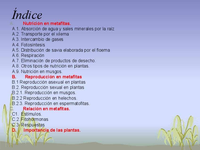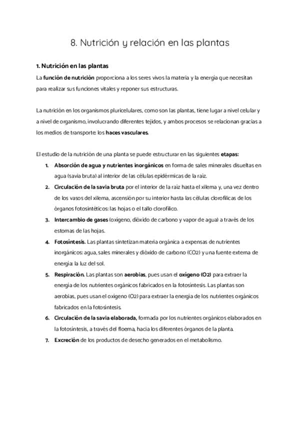 1. Nutrición en las plantas 2. Importancia biológica de la fotosíntesis 3. Otras formas de nutrición en las plantas 4. Relación en las plantas