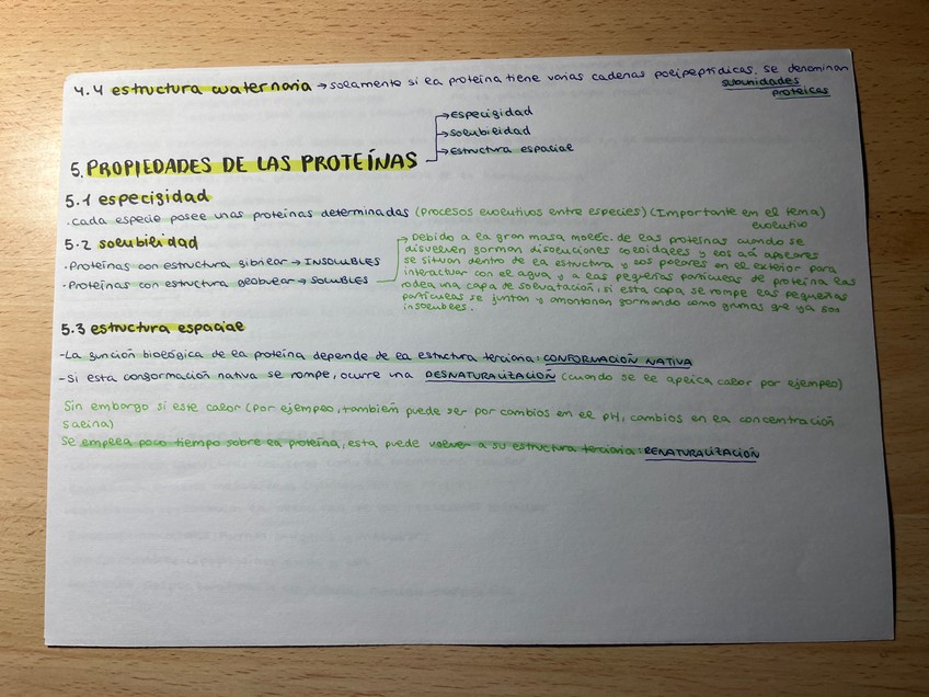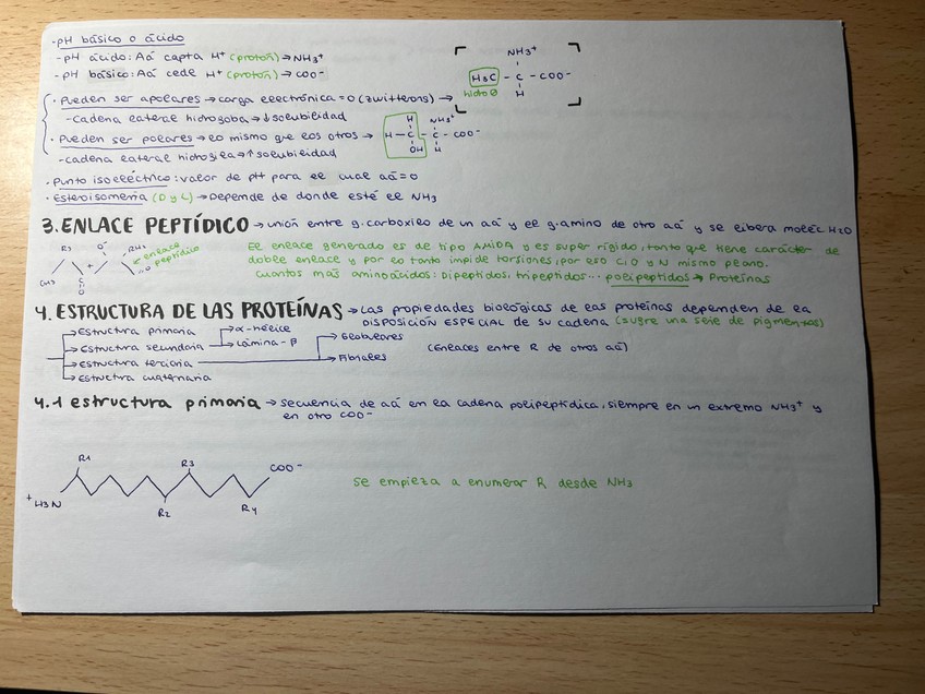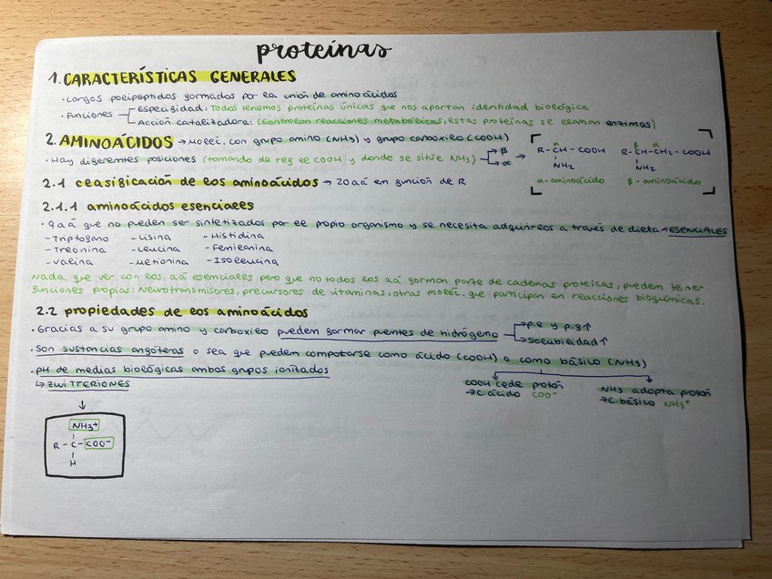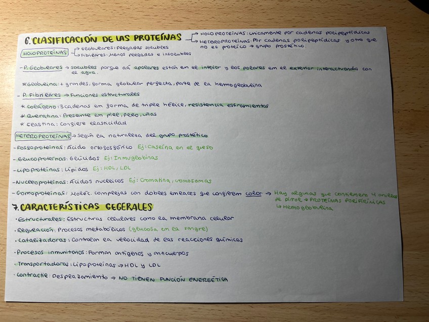 Apuntes de los proteínas, clasificación (esquematizada y posteriormente explicada), propiedades, enlace, características, tipos, funciones, etc.
