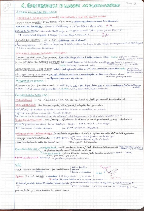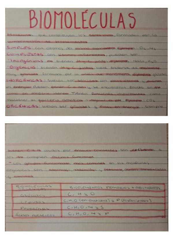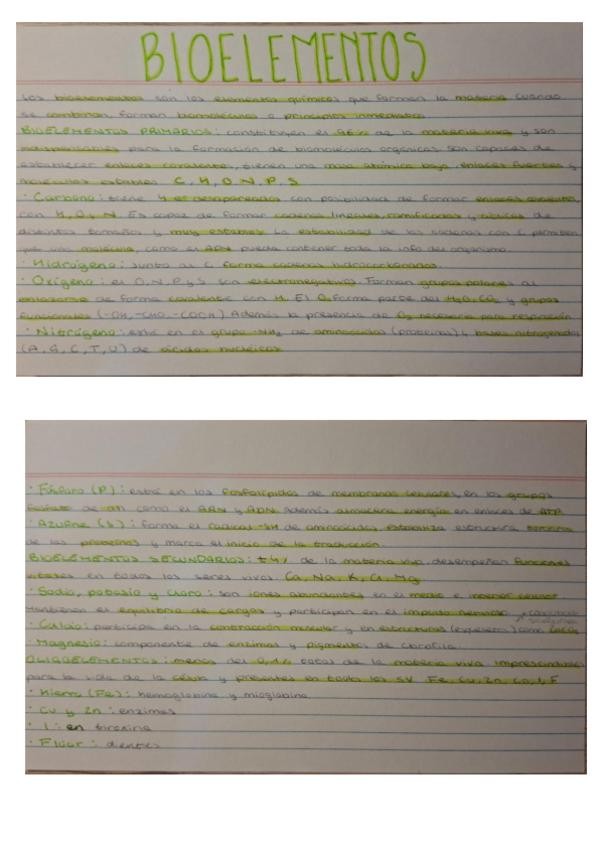 Apuntes de bioelementos, biomoleculas, el agua, sales minerales, pH y difusión, osmosis y diálisis. Saqué un 10 en el examen!