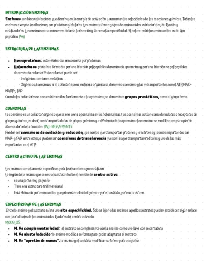 Apuntes sobre las enzimas, enfocados para la Pau y elaborados a partir de respuestas de PAU de exámenes anteriores.