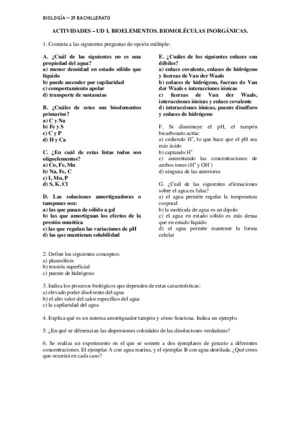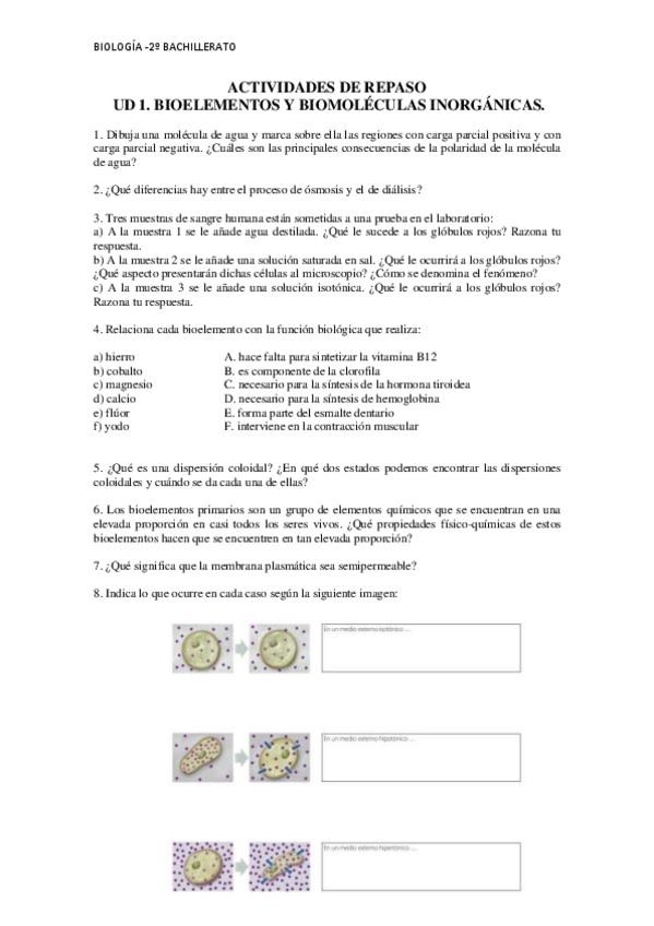 Os dejo ejercicios del tema 1 de 2º bach de bioelementos y biomoléculas inorgánicas