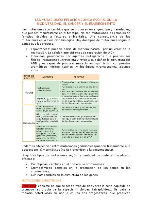 Este resumen trata sobre las mutaciones, la relación que tiene con la evolución, la biodiversidad, el cáncer y el envejecimiento