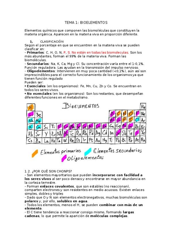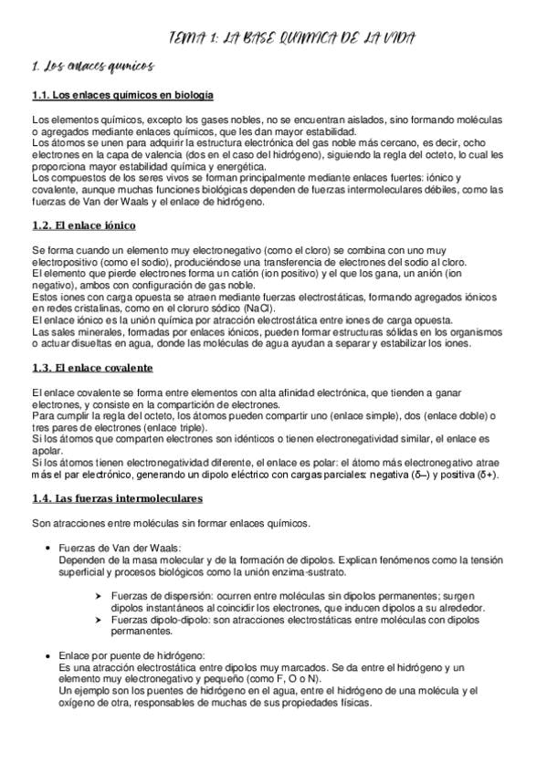 resumen tema 1 biologia: la base quimica de la vida para la PAU