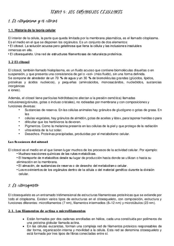tema 5 biologia: los organulos celulares resumido para PAU 2026 de la UCLM