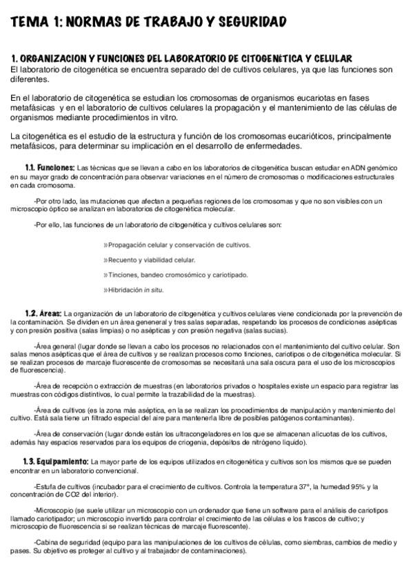 Resumen / esquema de los temas: - TEMA 1: ORGANIZACIÓN Y FUNCIONES DEL LABORATORIO DE CITOGENÉTICA Y CULTIVO GENERAL. MATERIALES Y EQUIPO BÁSICO. - TEMA 2: ORGANIZACIONES Y FUNCIONES DEL LABORATORIO DE BIOLOGIA MOLECULAR. MATERIALES Y EQUIPO BÁSICO. - T