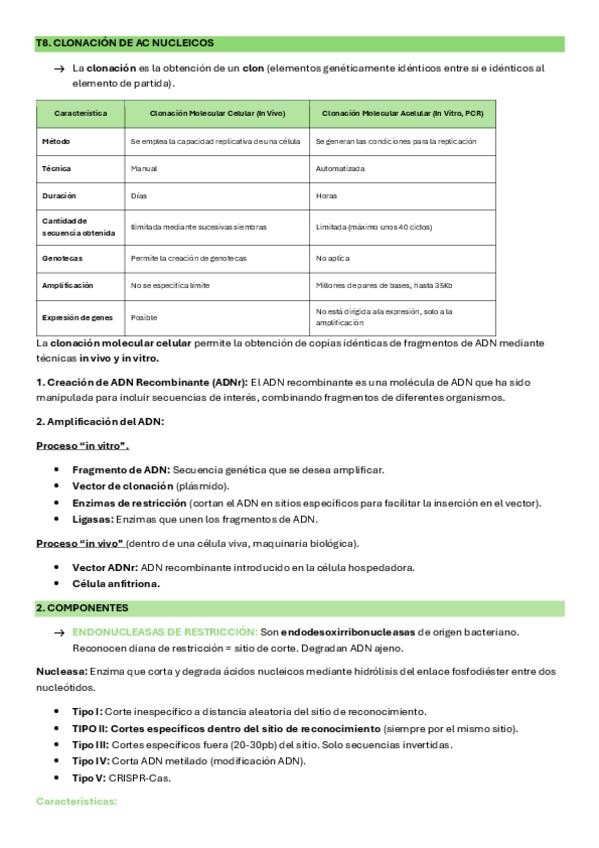 Apuntes sobre la clonación de ácidos nucleicos, donde se explican los conceptos básicos de la clonación molecular, sus componentes y los principales vectores de clonación. Incluye las fases del proceso, métodos habituales como transformación, transfección