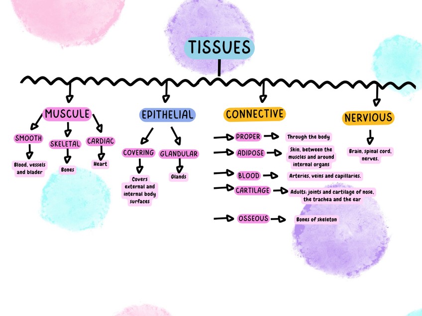 mapa conceptual sobre el cuerpo humano (tejidos, células...) y esquema sobre los componentes de la célula.