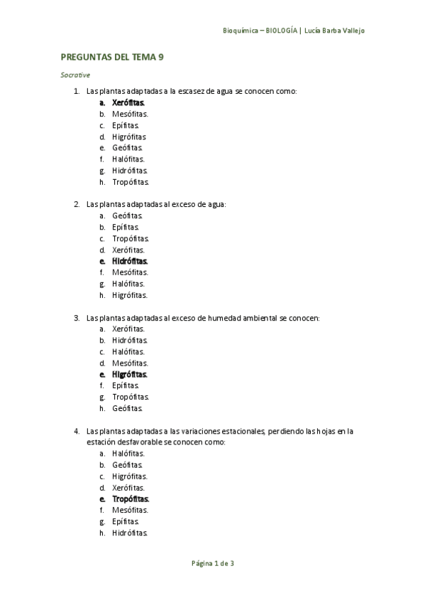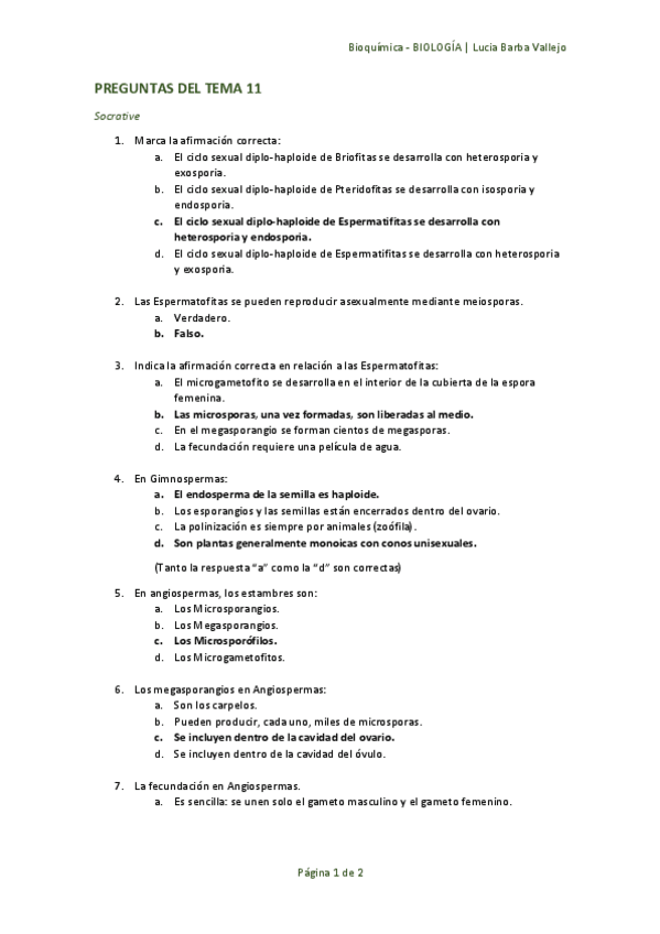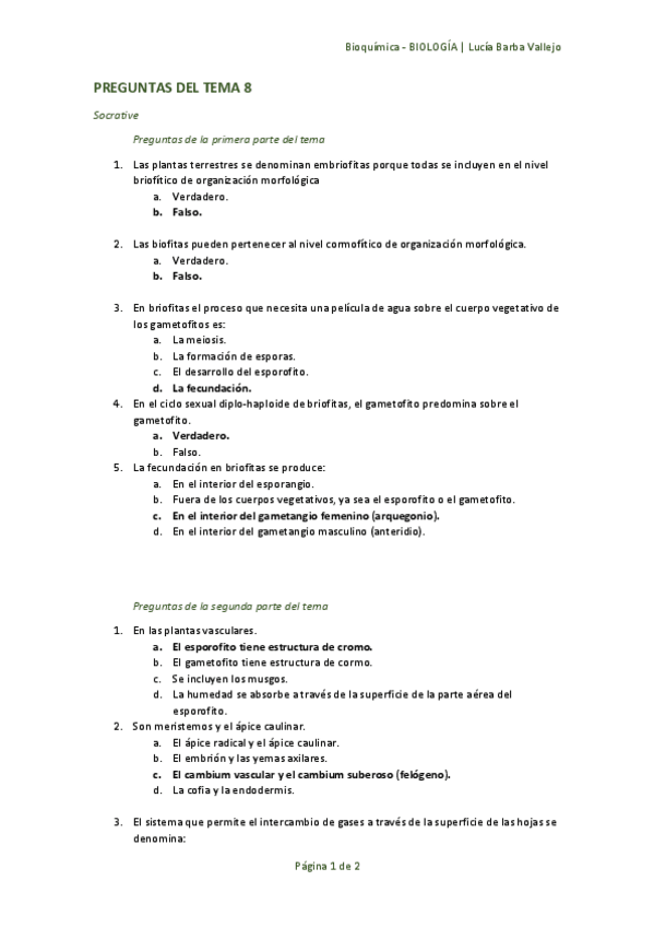 Biología Vegetal, preguntas tipo test