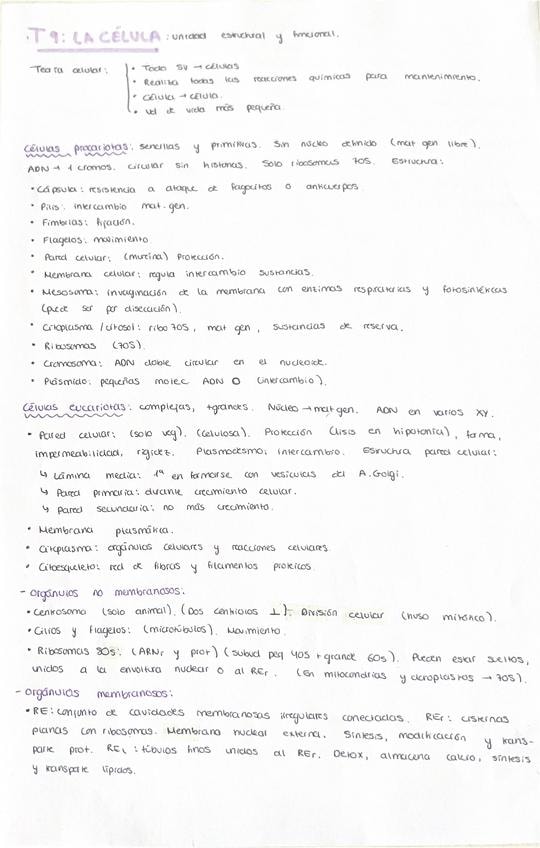 Temas 9 (la célula), 10 (envoltura celular), 11 (citosol, citoesqueleto y orgánulos) y 12 (núcleo, mitosis, meiosis) de biología resumidos.
