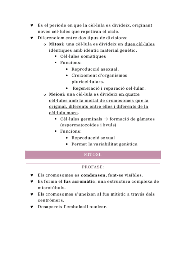 - Introducció al cicle cel·lular - Interfase - Introducció a la divisió cel·lular (amb tipus de cèl·lules i les seves classificacions) - Mitosi - Citocinesi (estrangulació i septe) - Meiosi (I i II) - Diferències entre mitosi i meiosi en taula comparati