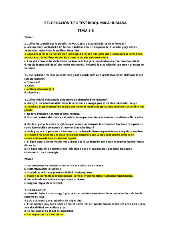 Examen Bioquímica Humana con preguntas del primer parcial + segundo parcial, CON RESPUESTAS