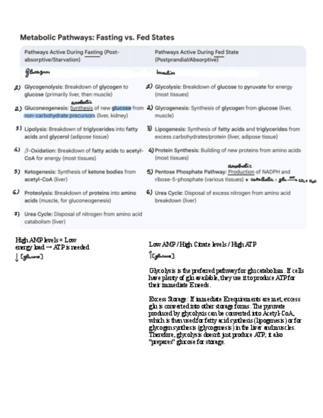First document: 1. Fasting vs Fed States 2. Insulin vs Glucagon 3. Localization of metabolic pathways 4. Gluconeogenesis 5. Pentose phosphate pathway 6. Glycogenesis 7. Glycogenolysis 8. β-oxidation 9. Similarities and differences between the four