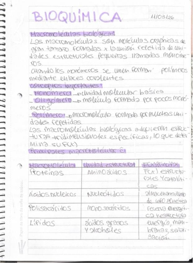 En este apunte a mano explico a grandes rasgos las macromoléculas, y más a detalle las proteínas y aminoácidos