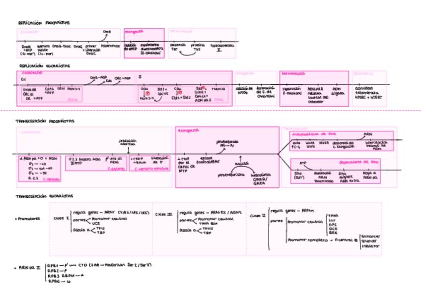 Esquema/ línea temporal de cada uno de los acontecimientos que ocurren en los principales procesos de transcripción y replicación (T5 y T6) correspondientes al primer parcial de bioquímica