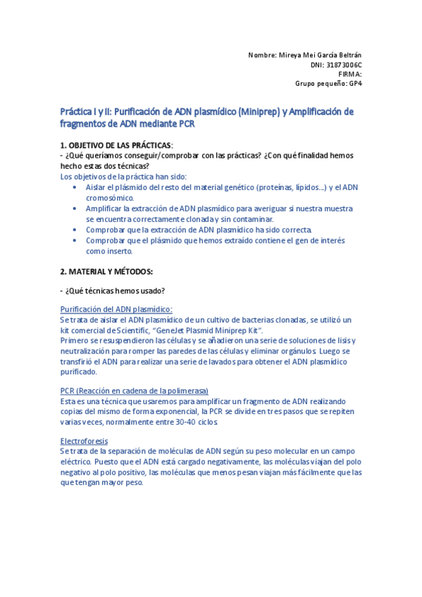 Nota 10: Memoria Práctica I y II Purificación de ADN plasmídico Miniprep y Amplificación de fragmentos de ADN mediante PCR.