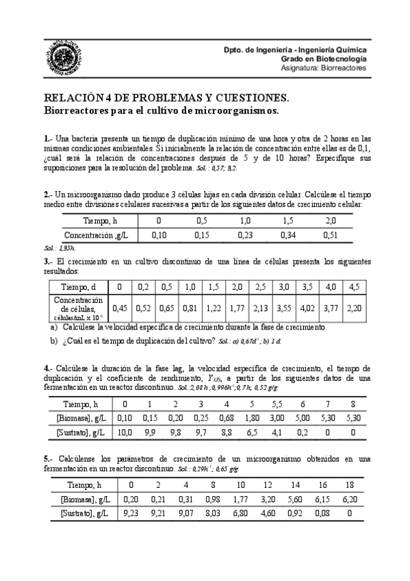 He publicado nuevos ejercicios de 2º Biorreactores: Relacion de problemas Tema 4