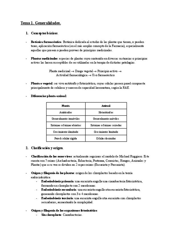 Resumen del primer tema de botánica farmacéutica con los conceptos importantes del mismo para el examen de primero de farmacia.