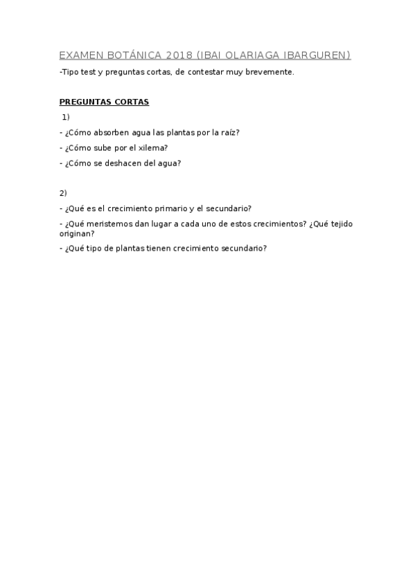 Examen parcial de botanica noviembre de 2025. Preguntas cortas largas y tipo test