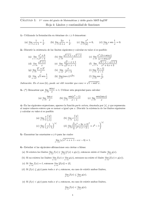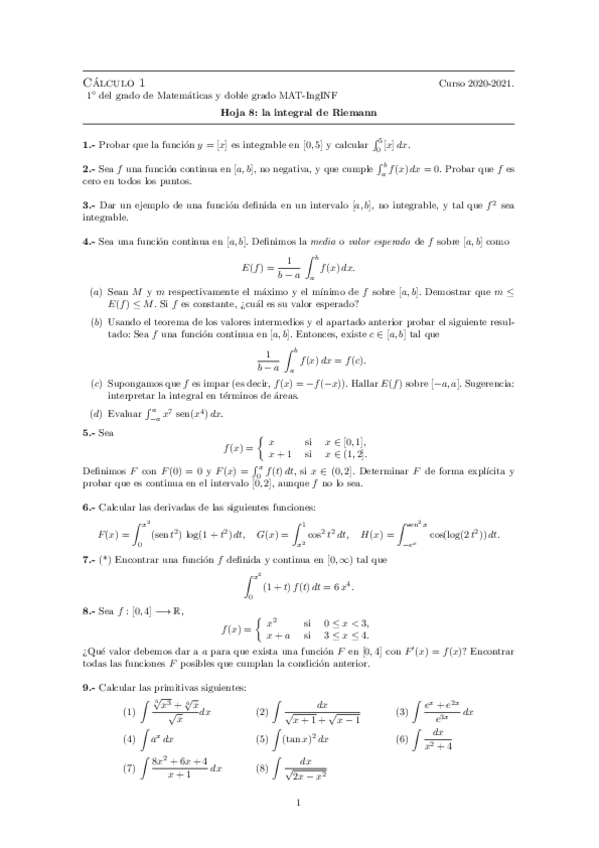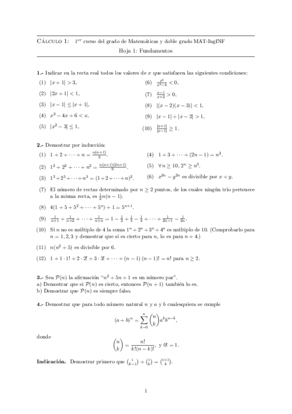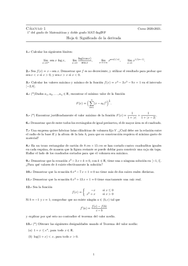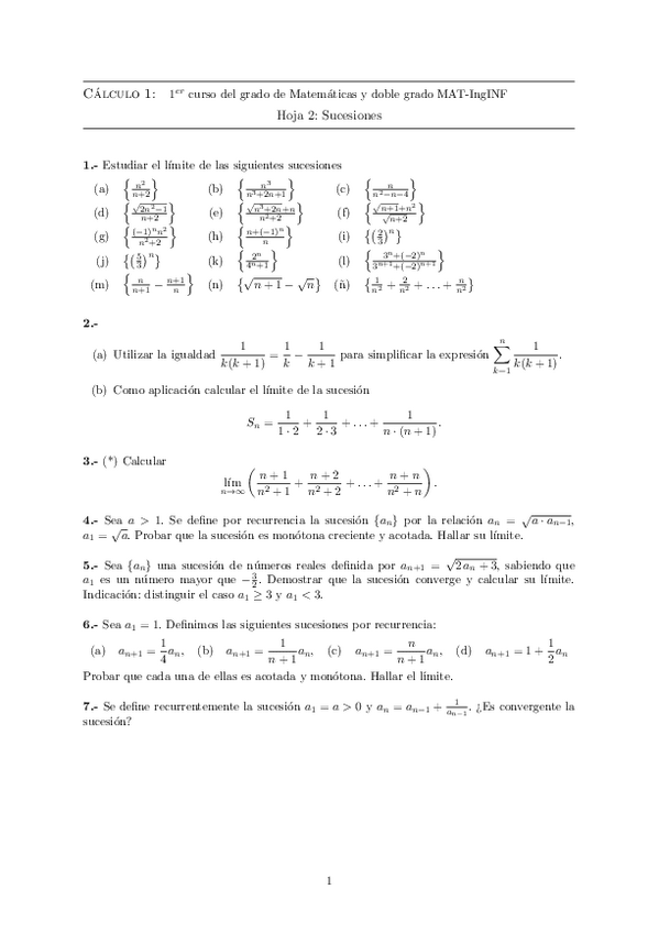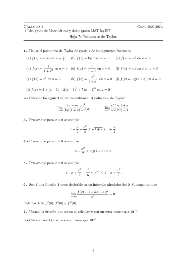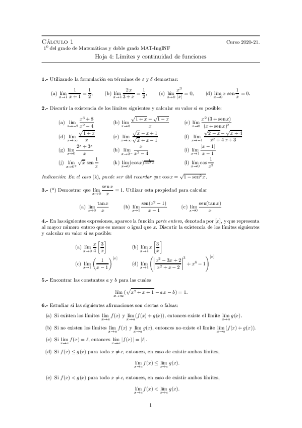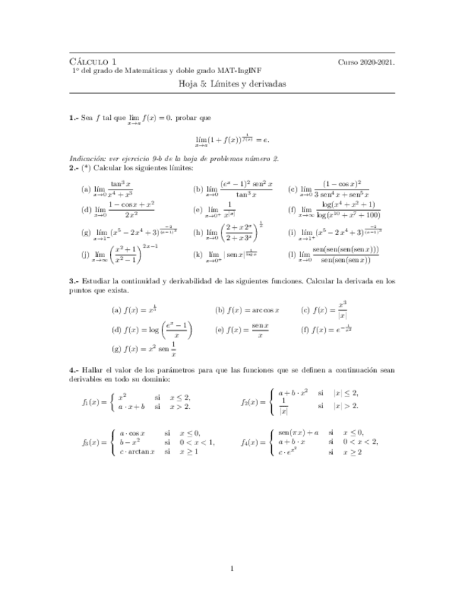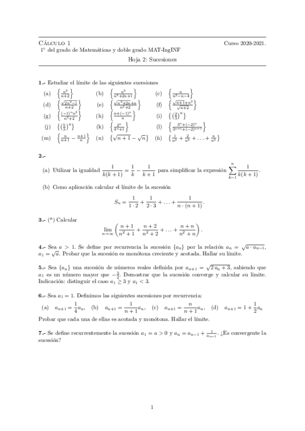 Hojas de ejercicios 2020-2021 Cálculo I