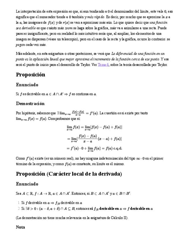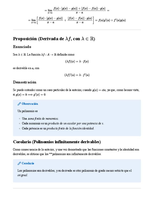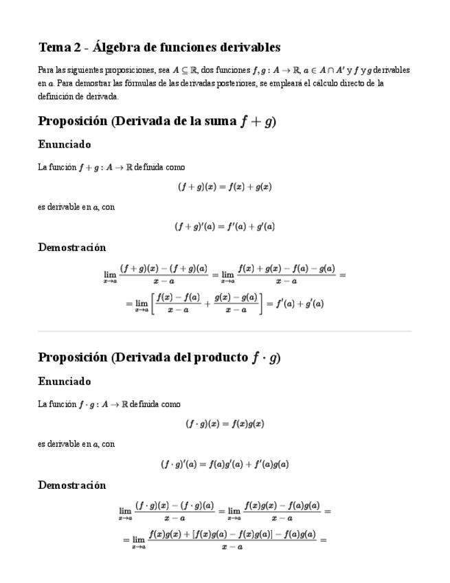 Proposiciones sobre la derivada de funciones compuestas: suma, producto, producto por escalar, cociente y composición. Todo teoría.