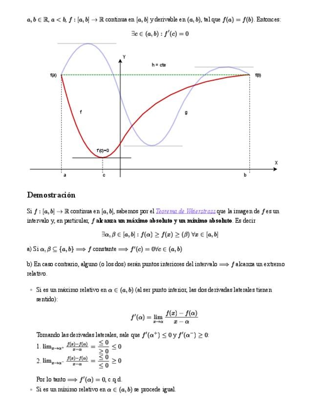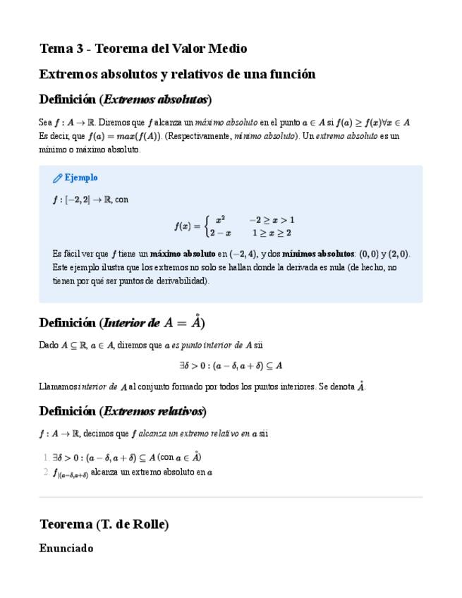 Tema muy completo y extenso que abarca los teoremas de Rolle y del Valor Medio y la teoría de los extremos relativos de una función. Visión aplicada de la derivada. Aparecen ejemplos.