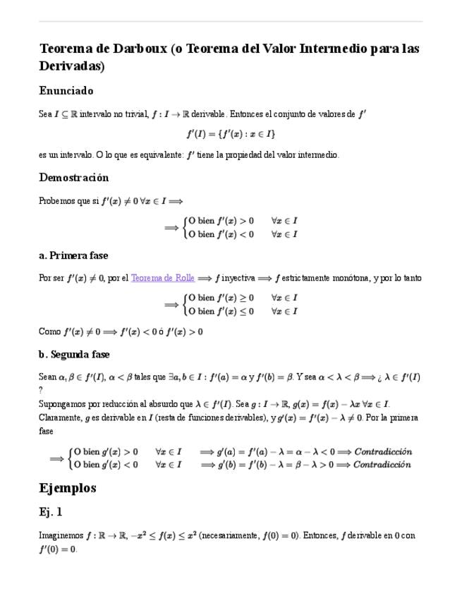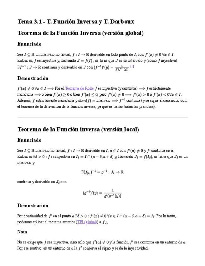 Teorema de la función inversa (versiones local y global), y teorema de Darboux (valor intermedio para la derivada). Dos ejemplos.