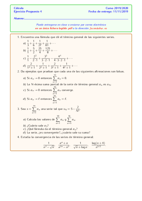 He publicado nuevos ejercicios de 1º Cálculo: Ejercicios-Tema-4-Series.pdf