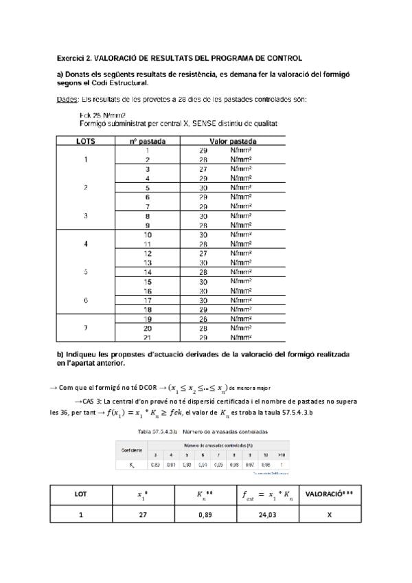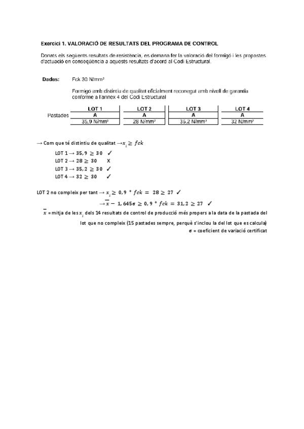 Exercicis 1, 2, 3 i 4 de Valoració de resultats CE del formigó.