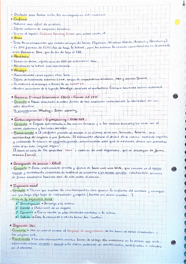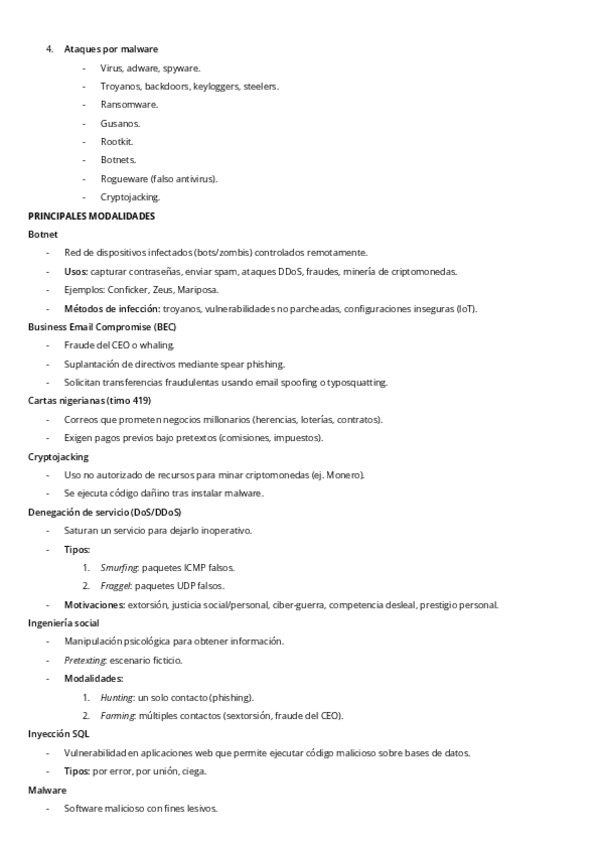Ciberdelincuencia y Agentes de la Amenaza: Botnet; Business E-Mail Compromise; Cartas Nigerianas; Cryptojacking; Denegación de Servicio; Ingeniería Social; Inyección Sql; Malware; Pharming; Phishing; Spear Phishing; Ransomware; Skimming; Spoofing; Spyware
