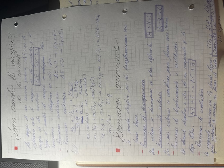 Apuntes de física y química de 2NDO de la ESO. Habla sobre los cambios de energía, las reacciones químicas y los tipos que hay , el ajuste de las reacciones químicas, la ley de la conservación de la masa y la velocidad de una reacción.