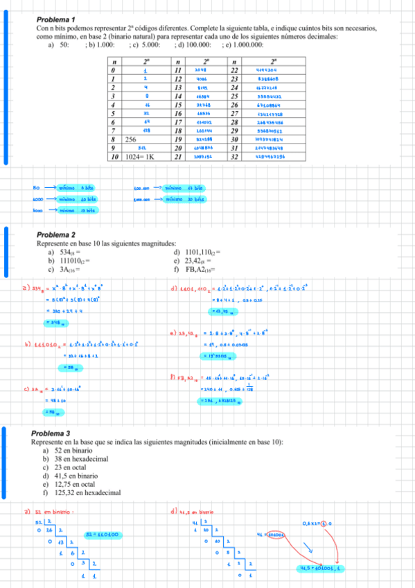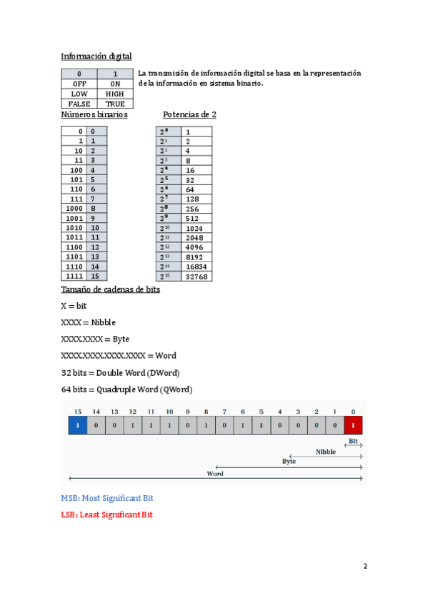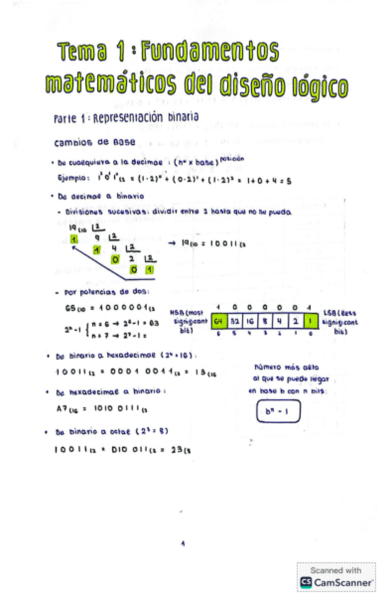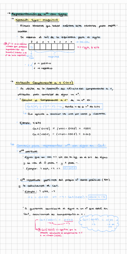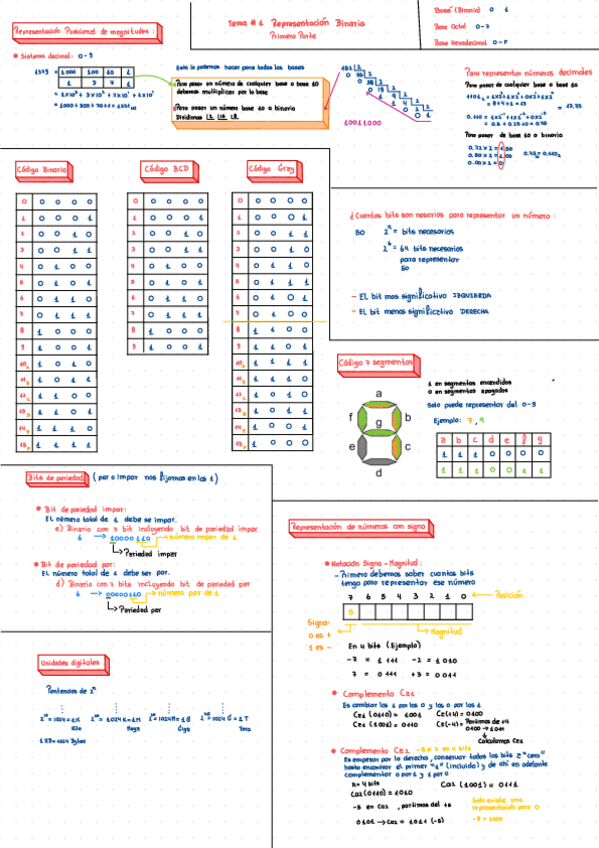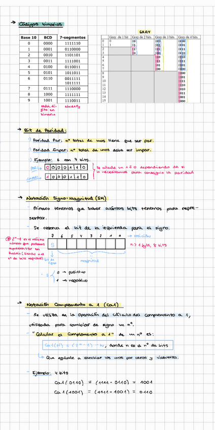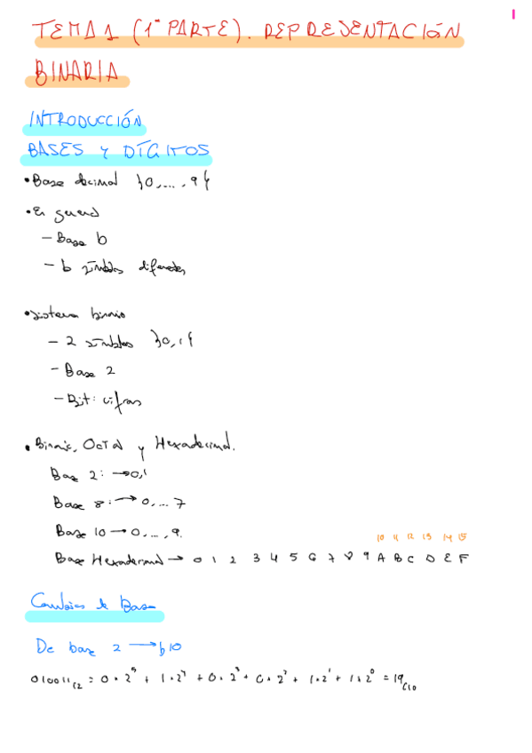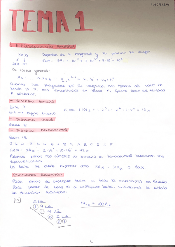 Apuntes resumidos del tema 1 - Representación binaria. Resumen hecho sobre los apuntes del profesor Francisco Pérez García