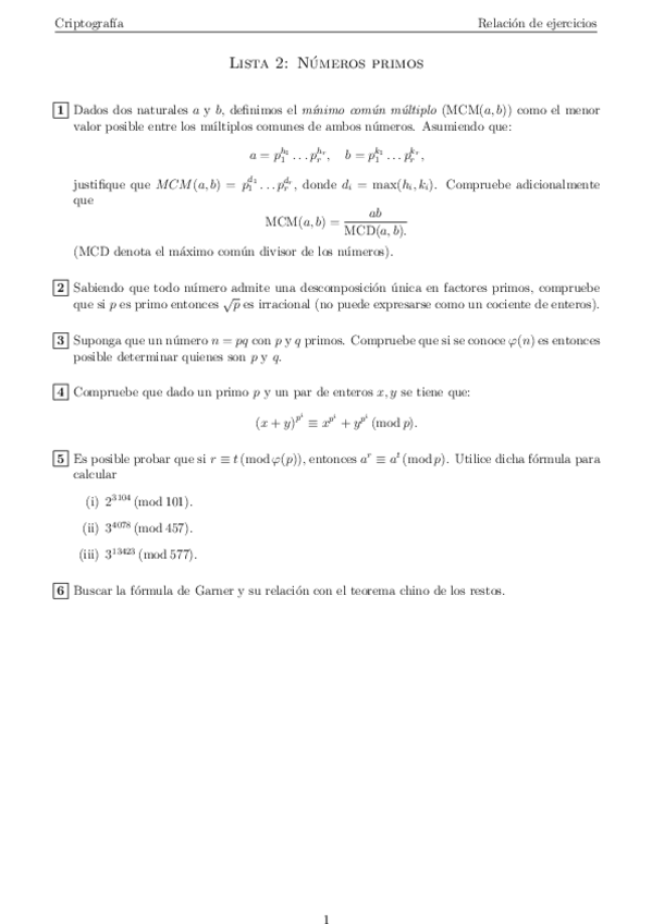 He publicado nuevos apuntes de 5º Códigos y Criptografía: Listas de ejercicios