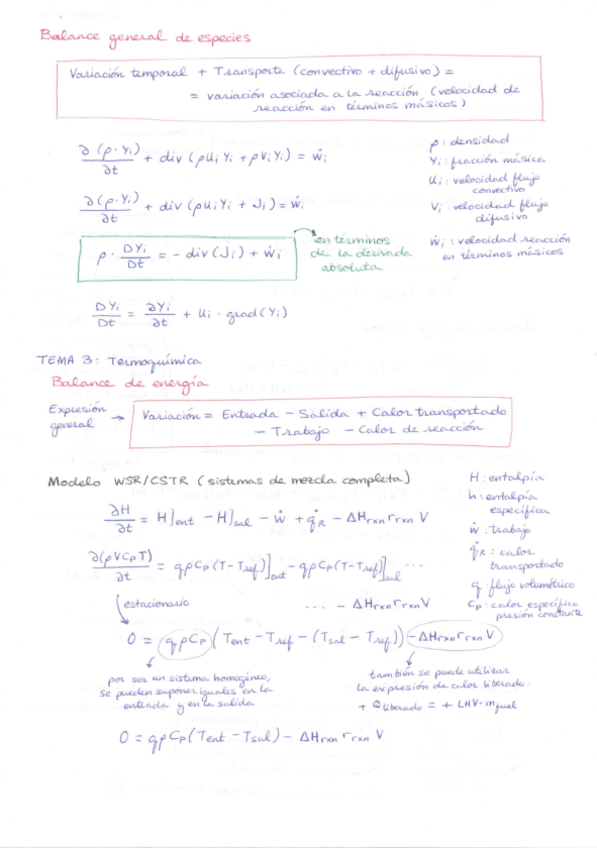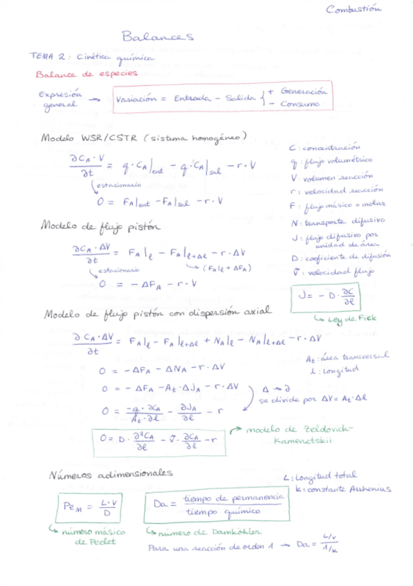 Balances de especies y de energía para los sistemas vistos en clase (WSR, flujo pistón y flujo pistón con dispersión axial) y expresiones generales.