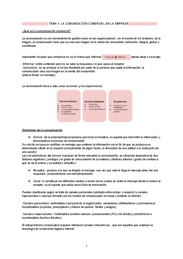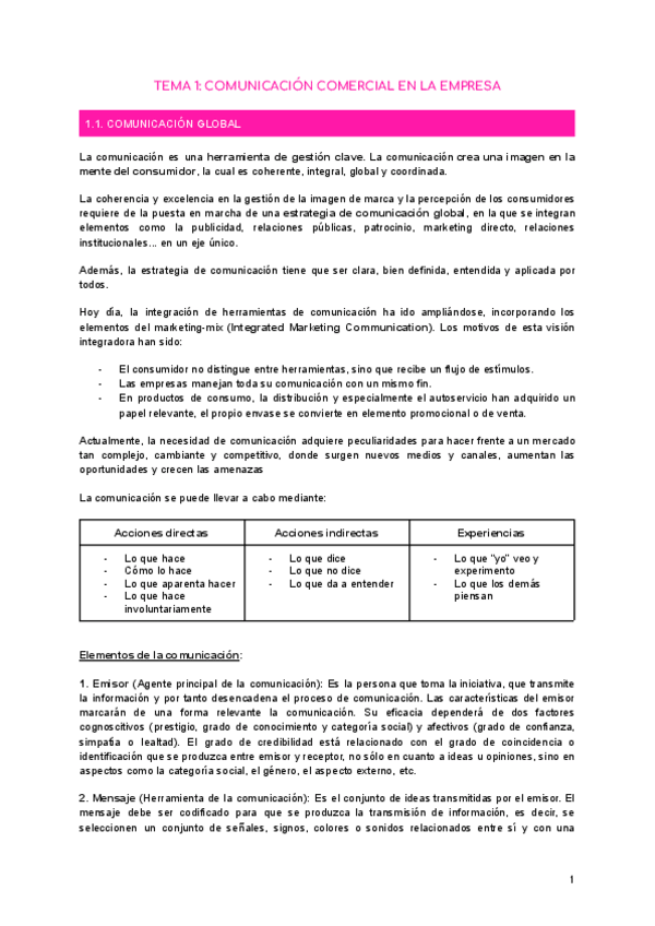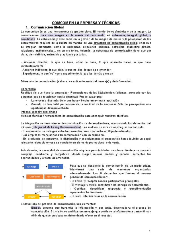 Apuntes resumidos (pág 1-14) del tema 1 de comcom sacados del libro de la profesora, con tipo tests (pág 14-15) y caso práctico (pág 15-20) resueltos de cara al examen.