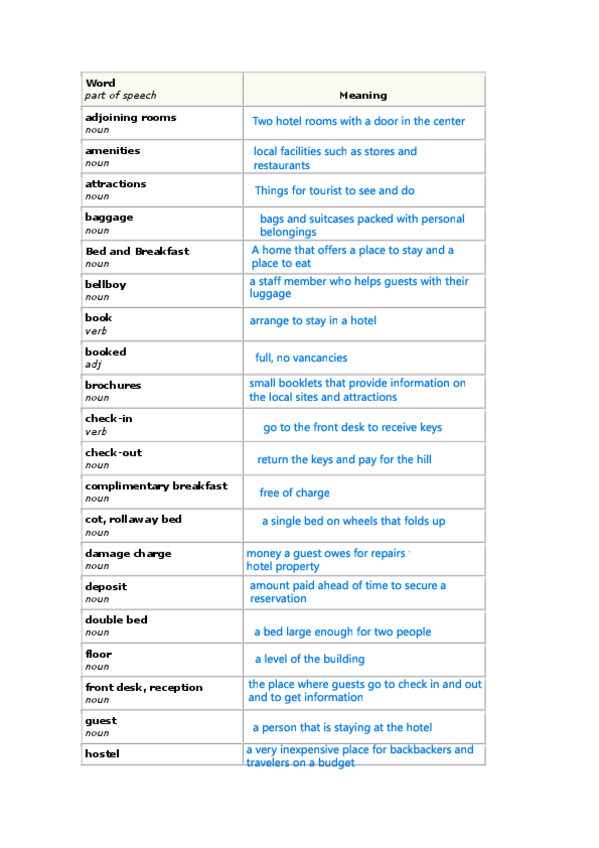 Ejercicios de vocabulario en inglés dentro del sector hotelero, nouns+ explanation
