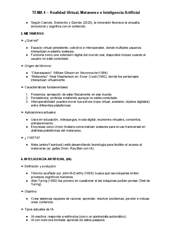 Resumen tema 4 - Inteligencia artificial, metaverso y realidad virtual