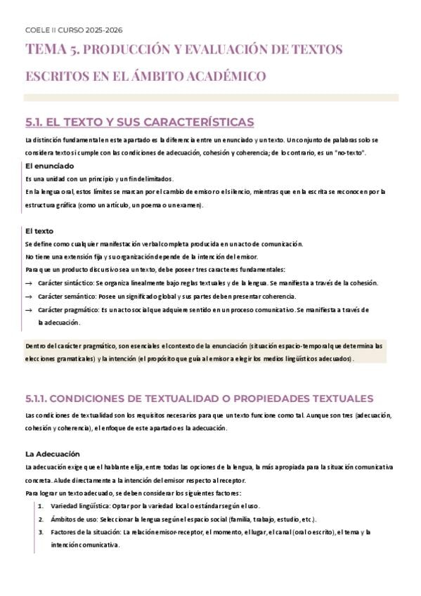 Resumen Tema 5 - Producción y evaluación de textos escritos en el ámbito académico. (El apartado de conclusiones es en sí un resumen muy escueto de lo anterior, por ello no está incluido en el resumen).