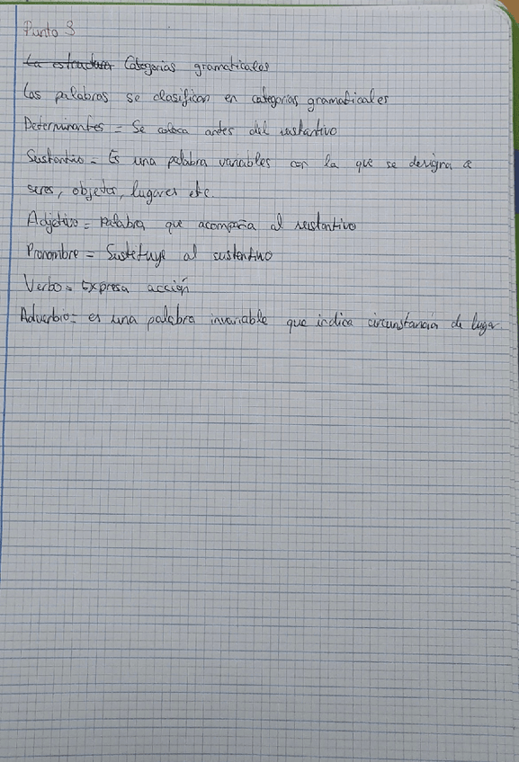 Esta foto es de mis apuntes del tema uno. Contiene una breve explicacion visual sobre las clases de palabras, el sustantivo, y como analizar morfologicamente el mismo con 3 ejemplos