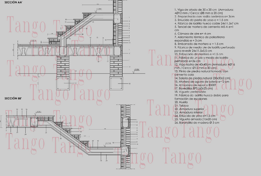 Detalle de dos secciones de escalera de apoyo y zapata con medidas y leyenda y escalado