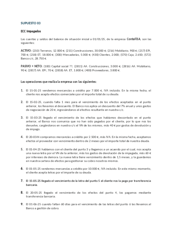 Contabilidad 2º Grado Superior Administración y finanzas Supuesto 3 ECC Impagados
