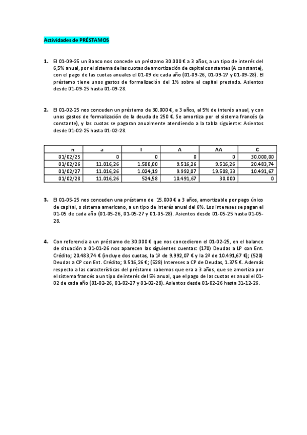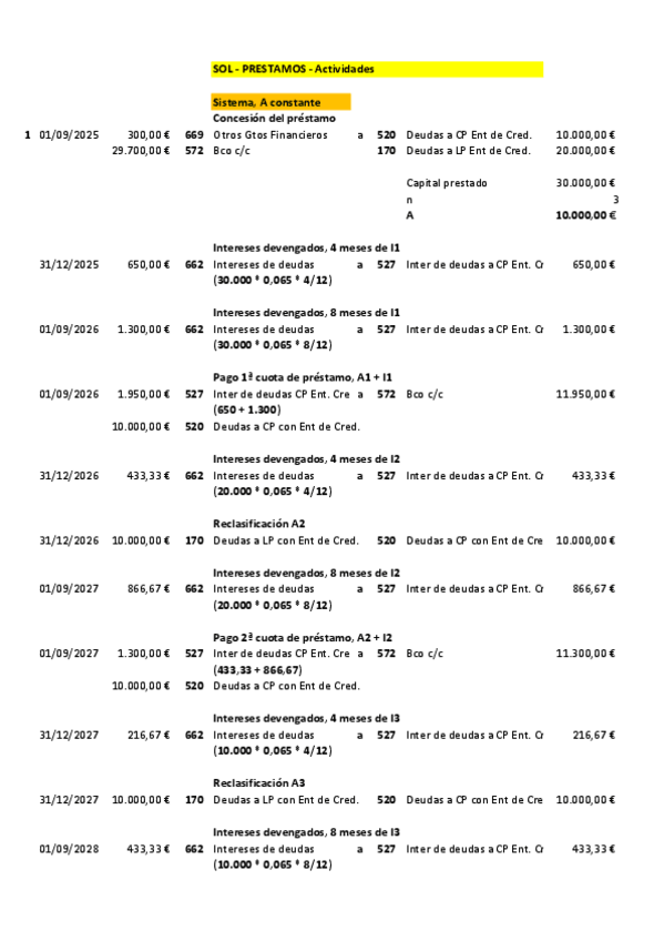 Contabilidad 2º Grado Superior Administración y finanzas Actividades de PRÉSTAMOS solución