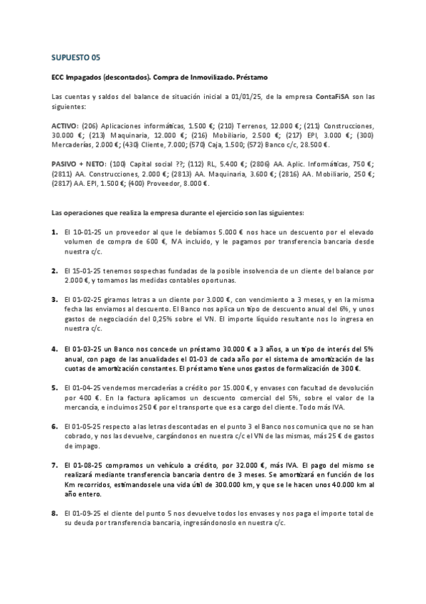 Contabilidad 2º Grado Superior Administración y finanzas Supuesto 05 ECC Impagados (descontados). Compra de Inmovilizado. Préstamo