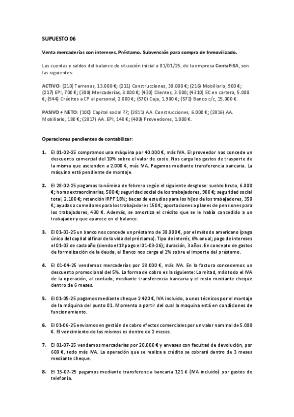 Contabilidad 2º Grado Superior Administración y finanzas Supuesto 06 Venta mercaderías con intereses. Préstamo. Subvención para compra de Inmovilizado.